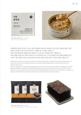 green onion flakes, while Deokhwa Canned Pollock Roe (Spicy) adds spiciness with chili-flavored oil, sunflower oil,